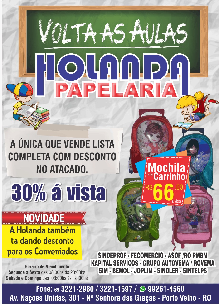 A Holanda Papelaria está com preços imperdíveis para esta volta as aulas, são descontos de até 30%. E mais, é a única que vende lista completa a preço de atacado. São descontos em vários itens e nos recebimentos à vista, cartões de débito e crédito que vão de 20 à 30%.