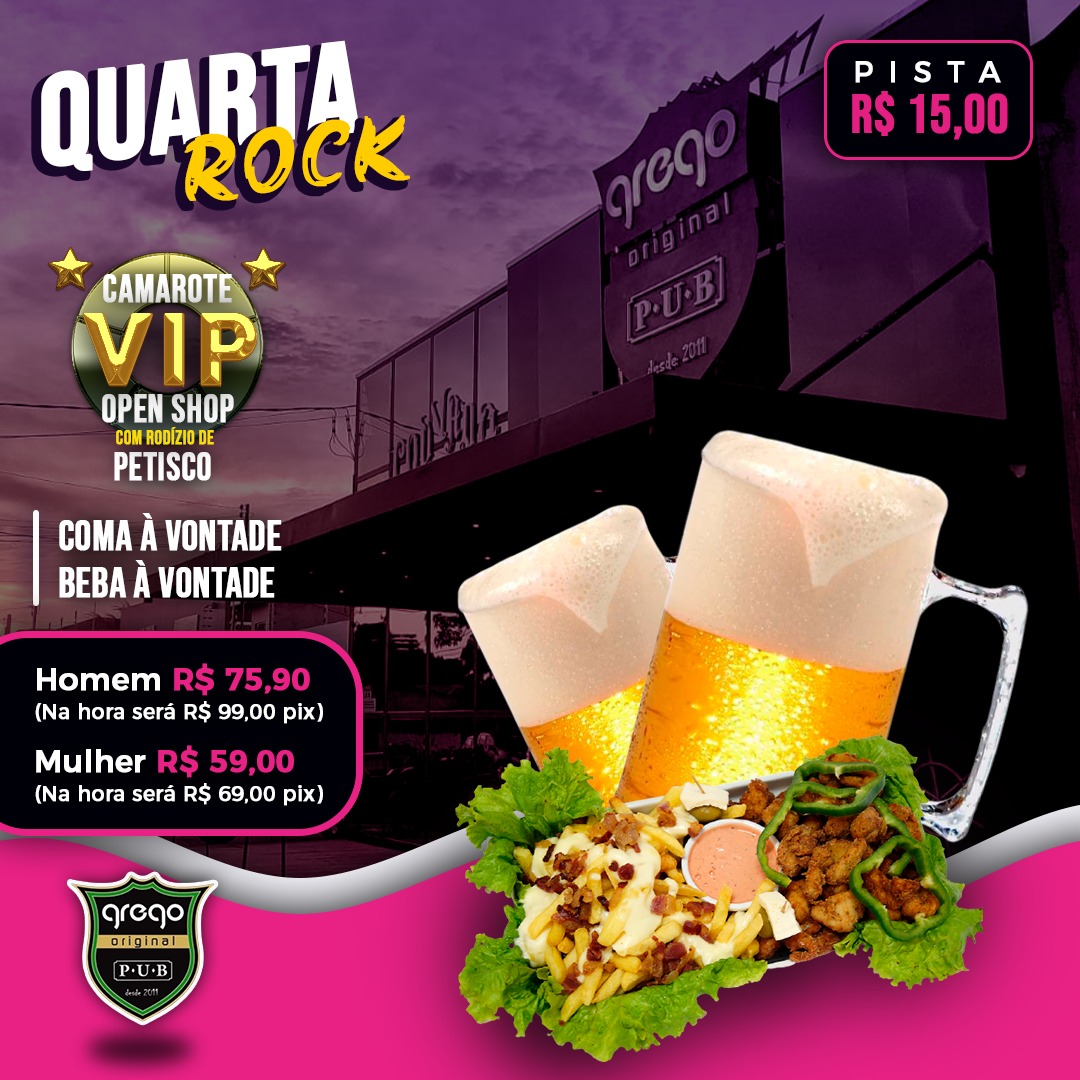 Todas as quarta, além de apresentação de DJ e shows de bandas de rock, é o dia do futebol e também do Camarote Vip Open Chopp Pilsen e rodada de petisco no