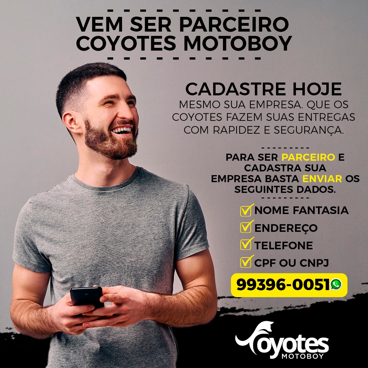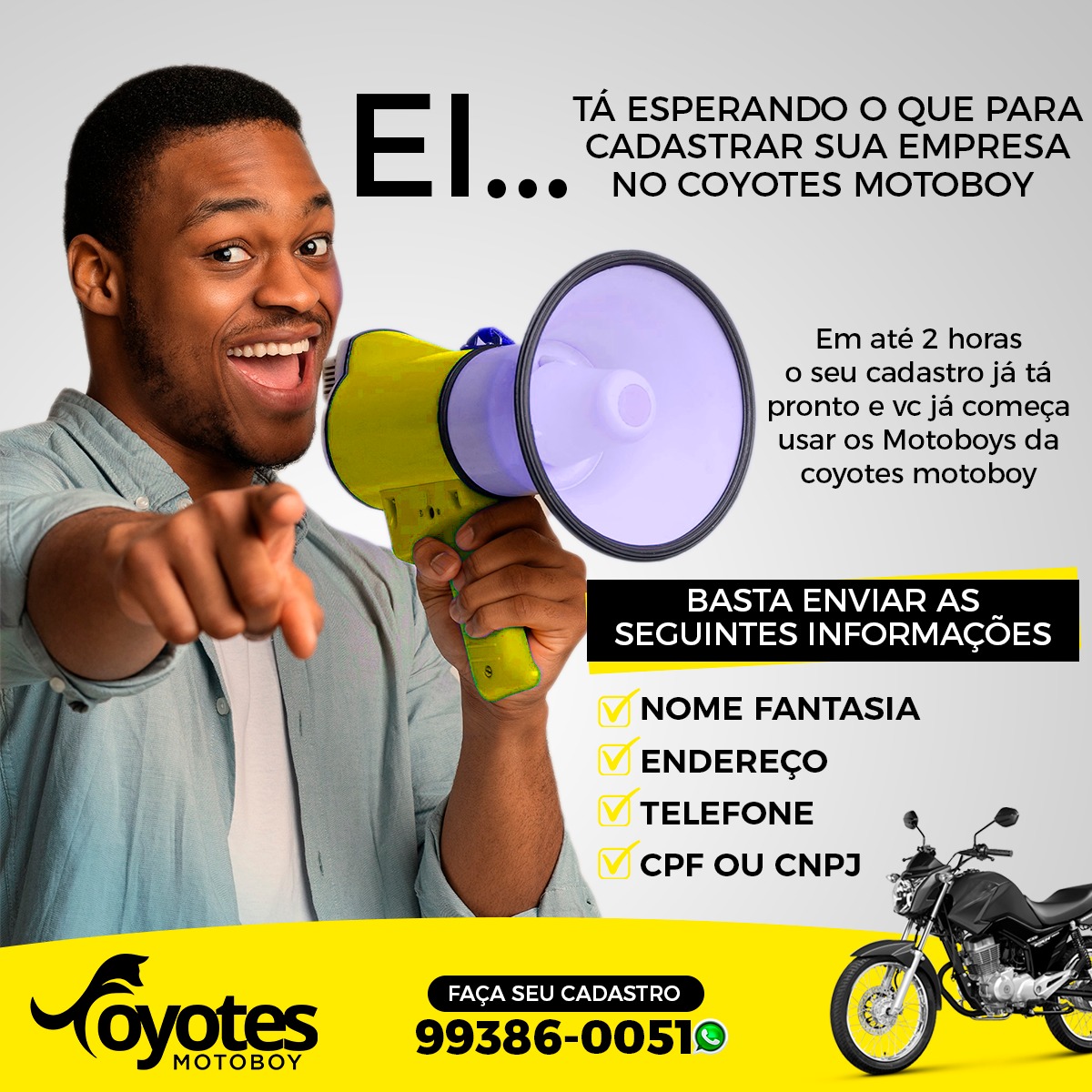 E se seu empreendimento ainda não utiliza dos recursos da Coyotes, agora você tem oportunidade. Faça o cadastro seguindo o passo a passo e em até duas horas o acesso é liberado. É fácil demais, veja como se cadastrar abaixo: