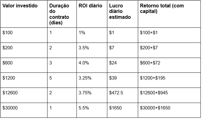 O sistema oferece contratos flexíveis de investimento, com retornos diários calculados com base na taxa de hash alugada, duração do contrato e desempenho do mercado.