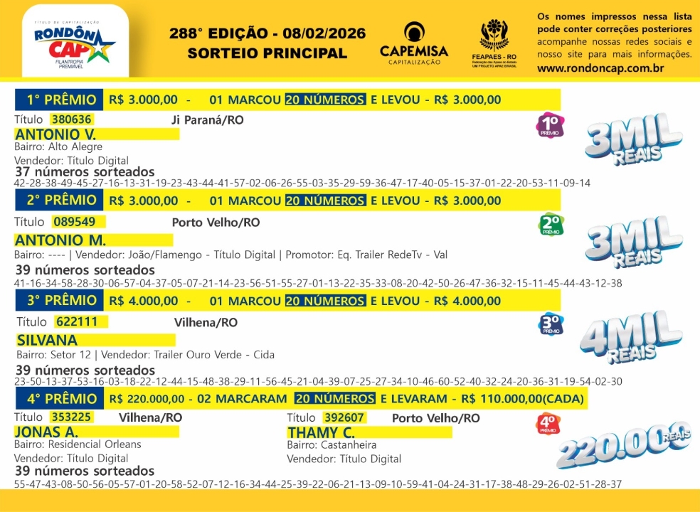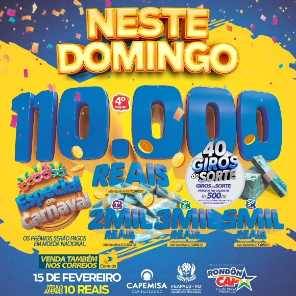 O RondonCAP Especial de Carnaval quer ver você pular de alegria! No 4º premio tem 110 mil reais em dinheiro para você fazer a festa e o titulo só 10 reais.