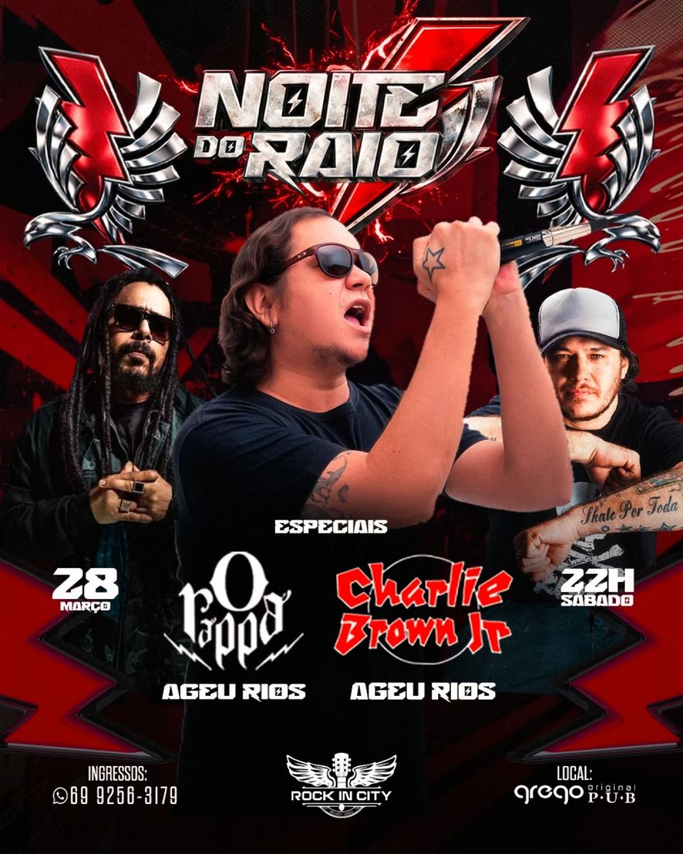 Dia 28 de março, às 22h no Grego Original Pub vai rolar uma noite épica com muito Rock nacional, cover com Ageu Rios mandando as melhores de Charlie Brown Jr e O Rappa, pré show com a banda Vibe com o melhor do Brega Rock.
