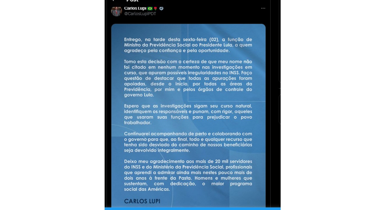 Carlos Lupi (PDT) anunciou no fim da tarde desta sexta-feira, 2, sua demissão do cargo de ministro da Previdência Social, em meio às investigações de um suposto esquema de fraude no Instituto Nacional do Seguro Social (INSS).