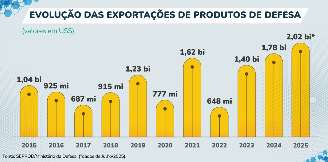 A Base Industrial de Defesa (BID) do Brasil alcançou mais um recorde após ultrapassar US$ 2 bilhões em autorizações de exportações de produtos e serviços. A cifra registrada somente de janeiro a julho deste ano, representa cerca de 113% do total obtido em 2024 (US$ 1,78 bi) - último melhor resultado da série histórica (2015 - 2024).