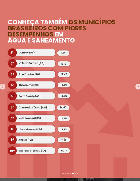 Enquanto municípios paulistas como Severínia e Júlio Mesquita atingiram pontuações acima de 99 pontos, locais como Vale do Paraíso (RO) registraram notas inferiores a 15, indicando sérios problemas no acesso à água potável e ao esgotamento sanitário.