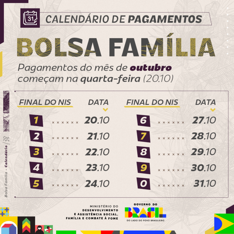 O Bolsa Família é depositado de maneira escalonada. Os pagamentos de outubro começaram a ser feitos na 2ª feira (20.out). Os beneficiários com NIS (Número de Identificação Social) final 1 já podem movimentar os valores.