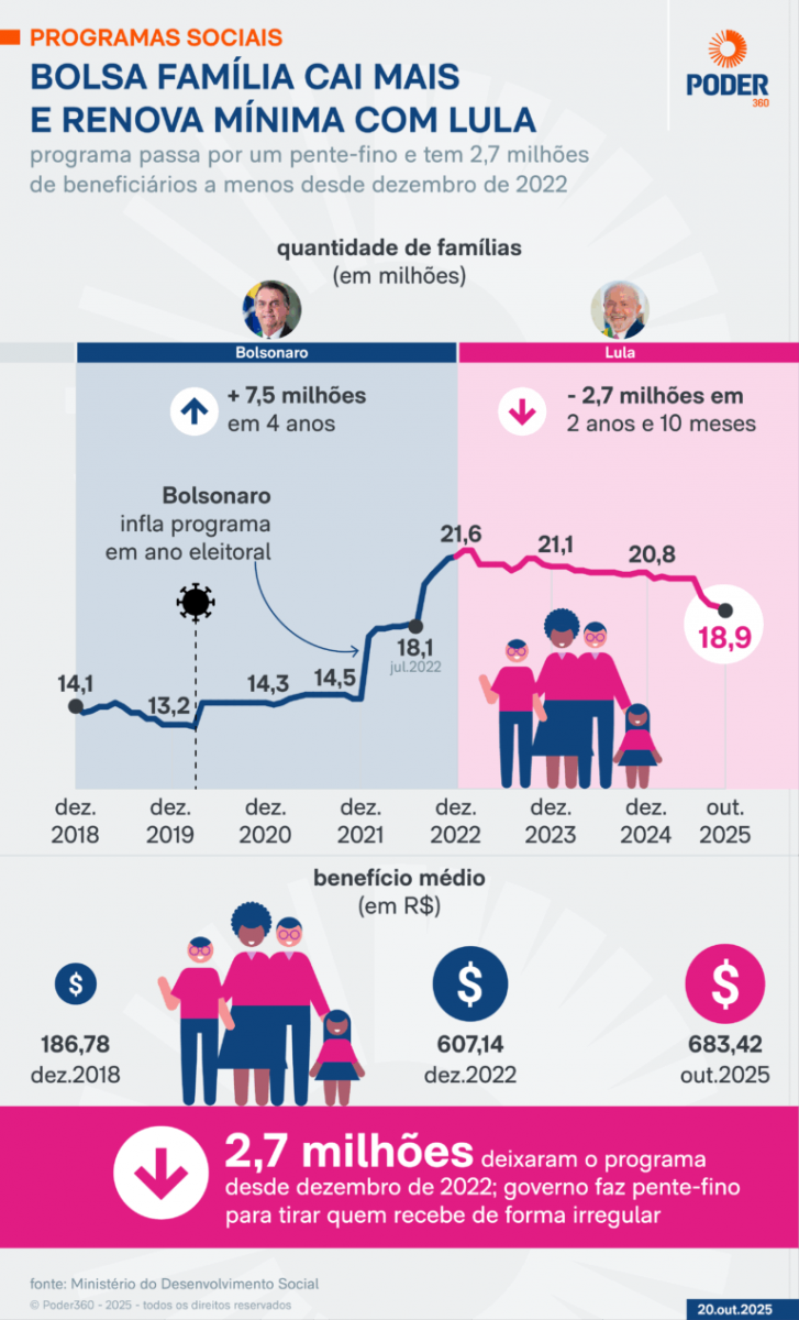 O número de beneficiários do Bolsa Família segue em queda e chegou a 18,9 milhões em outubro. O programa social renovou sua mínima no 3º governo de Luiz Inácio Lula da Silva (PT). Está no menor patamar desde julho de 2022, quando tinha 18,1 milhões de famílias. Os dados divulgados agora mostram um saldo negativo de 2,7 milhões de inscritos na comparação com o fim de 2022 –quando Jair Bolsonaro (PL) deixou o poder. As saídas começaram a ser registradas com maior intensidade em julho deste ano.