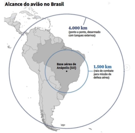 O F-39E Gripen, operado pela Força Aérea Brasileira e sediado na Base Aérea de Anápolis, foi estrategicamente posicionado no centro do país para garantir rápida resposta a qualquer ponto do território nacional. A partir dessa localização, o raio de combate aproximado de 1.500 km permite cobrir praticamente todo o espaço aéreo brasileiro em missões de defesa, interceptação e patrulha. Já o alcance de translado, que pode chegar a cerca de 4.000 km, demonstra a capacidade de deslocamento estratégico da aeronave em cenários de reforço ou projeção operacional.