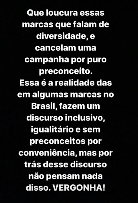 "Essa é a realidade em algumas marcas no Brasil, fazem um discurso inclusivo, igualitário e sem preconceitos por conveniência, mas por trás desse discurso não pensam em nada disso. VERGONHA!", escreveu a cantora nos stories.