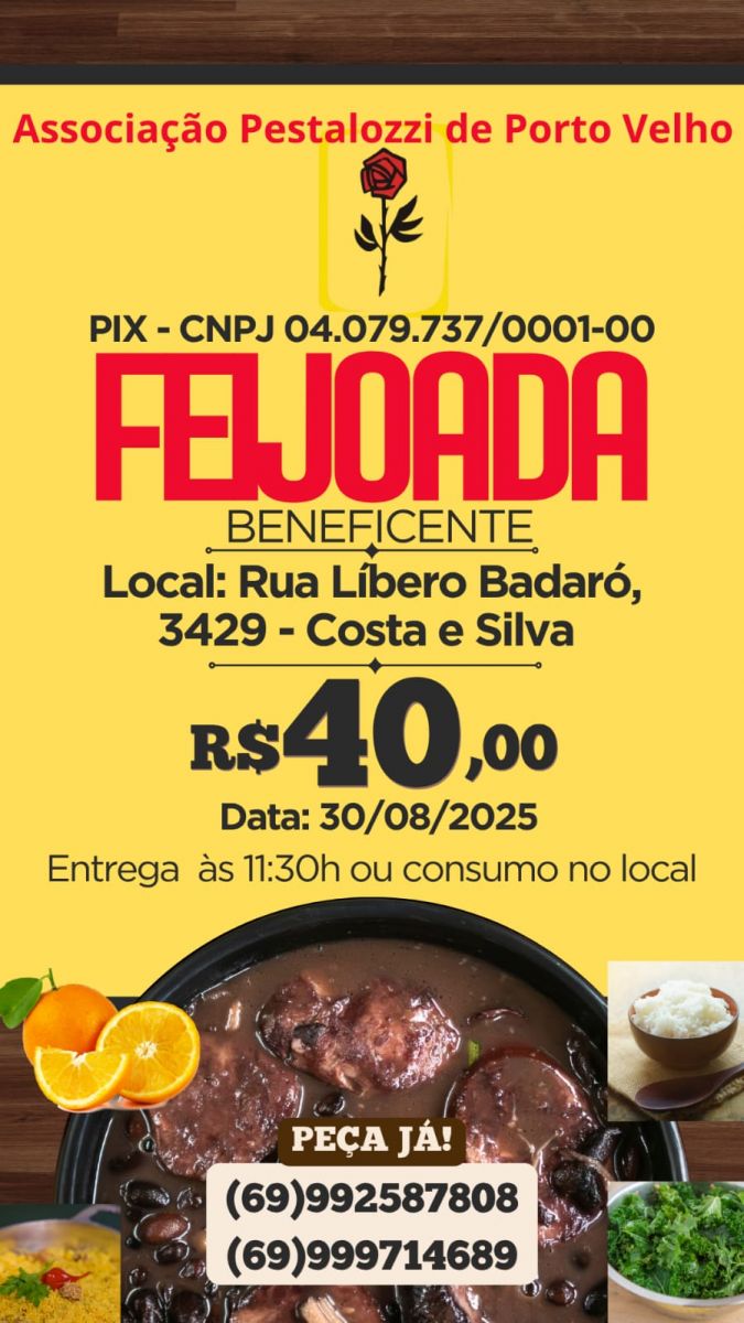 A Associação Pestalozzi de Porto Velho, entidade que atua no amparo e ensino de pessoas portadoras de necessidades especiais, estará realizando uma Feijoada Beneficente para arrecadação de recursos para a manutenção das atividades. O evento será no sábado (dia 30/08), na sede localizada na rua Líbero Badaró, 3429, bairro Costa e Silva.