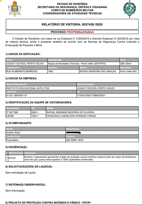 A situação do Colégio Legacy se torna ainda mais complicada quando, ao analisarmos os documentos, constata-se que a instituição não possui Certificado de Conformidade do Corpo de Bombeiros. Esse documento é obrigatório para qualquer local que receba alunos ou que permita a aglomeração de pessoas (comércio, escritório, condomínio, indústria, etc).