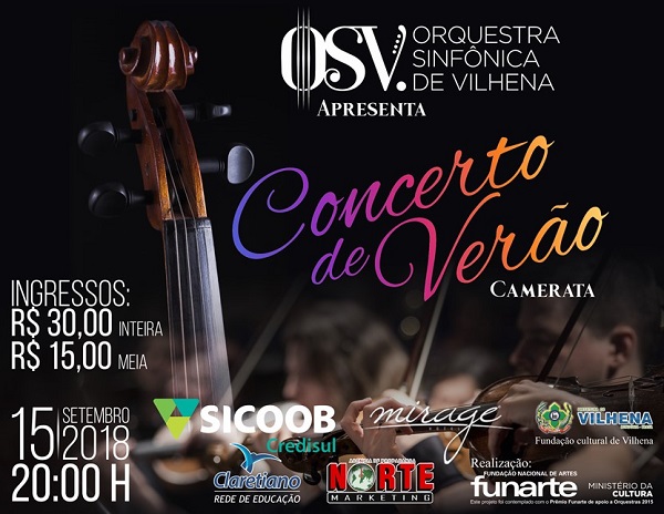 A Orquestra Sinfônica de Vilhena (OSV) vai apresentar no sábado, 15/9, o ‘Concerto de Verão’. O evento acontecerá a partir das 20h, na Sala Expansão no 2º andar do Centro de Treinamento e Cultura Sicoob Credisul – CTC Sicoob Credisul, em Vilhena. Os ingressos custam R$ 30 (inteira) e R$ 15 (meia).