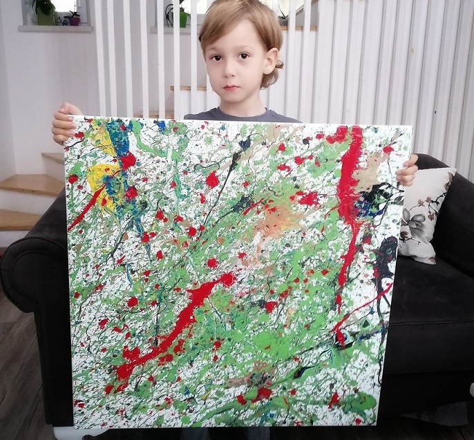 Então, tive a ideia de que Tristan podia pintar, mas de uma maneira e estilo diferentes. No dia seguinte, Tristan conseguiu seu primeiro conjunto de cores acrílicas e imediatamente começou a espirrar, pingar e pintar as fotos.