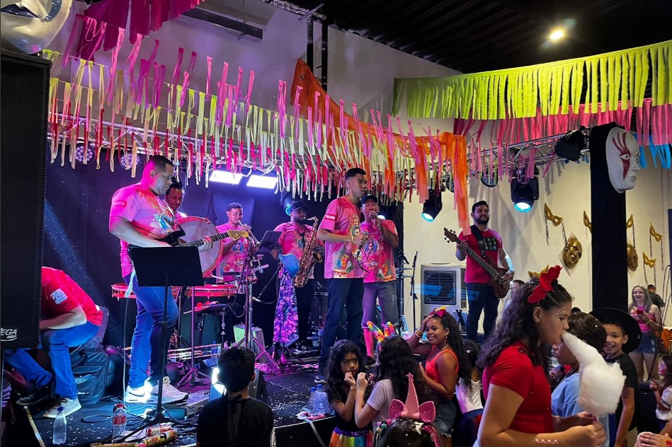 Festa carnavalesca para crianças, com brincadeiras, música e diversão.