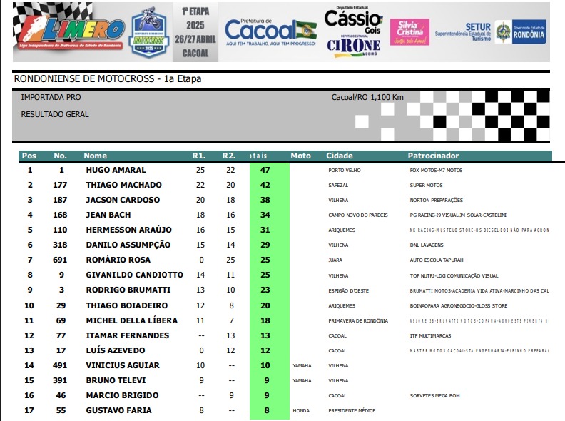 Na categoria Importada Pró, a mais forte do campeonato, o piloto Hugo Amaral #1 de Porto Velho mostrou porque ostenta o numero 1 na moto e novamente ficou na primeira posição, somando 47 pontos. Thiago Amaral #177 de Sapezal (MT) na segunda posição e Jacson Cardoso #187 de Vilhena em terceiro.