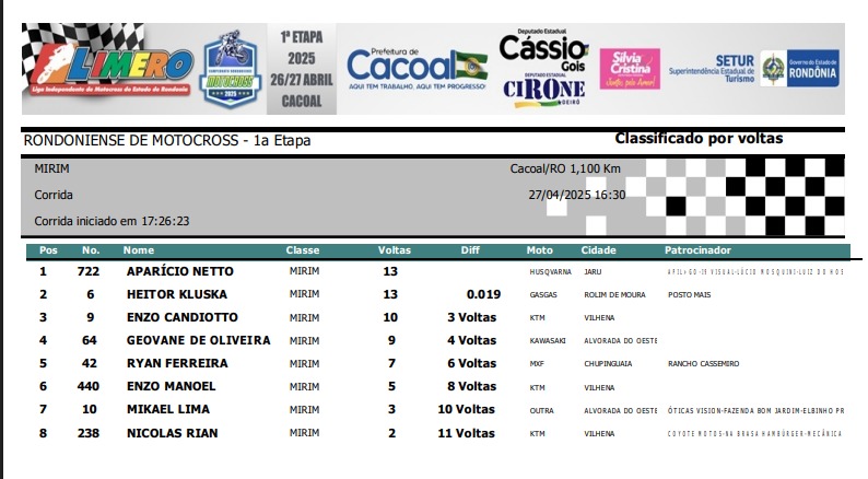 Na categoria que é o futuro do MX em Rondônia, a Mirim, vitória apertada do talentoso Aparicio Netto #722 de Jaru que ficou menos de 2 segundos na frente deo segundo colocado Heitor Neto #6 de Rolim de Moura. Enzo Candiotto #9 de Vilhena em terceiro.