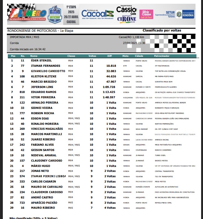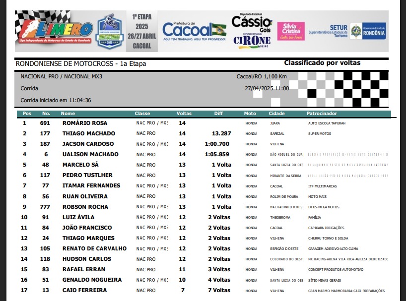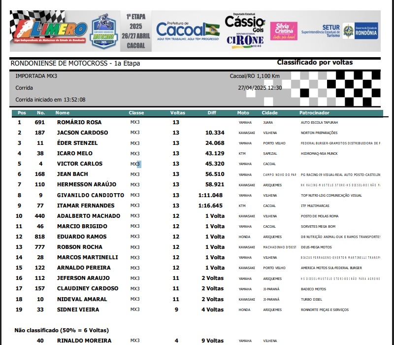 Na importada MX3, vitória do mato-grossense de Juara, piloto Romario Rosa #691, seguido de Jacson Cardoso #187 de Vilhena e em terceiro o portovelhense Eder Stenzel #11.