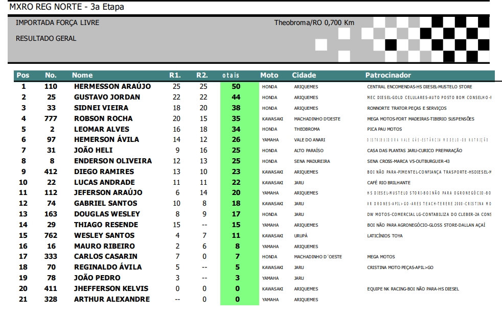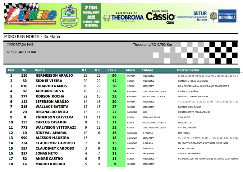 Na categoria MX3, mais uma vez o município de Ariquemes fez bonito, ficando com as três primeiras colocações com Hermerson Araujo #110, seguido de Sidnei Vieira #33 e Eduardo Ramos #818. Completaram o pódio Adriano Silva #87 e Robson Rocha #777