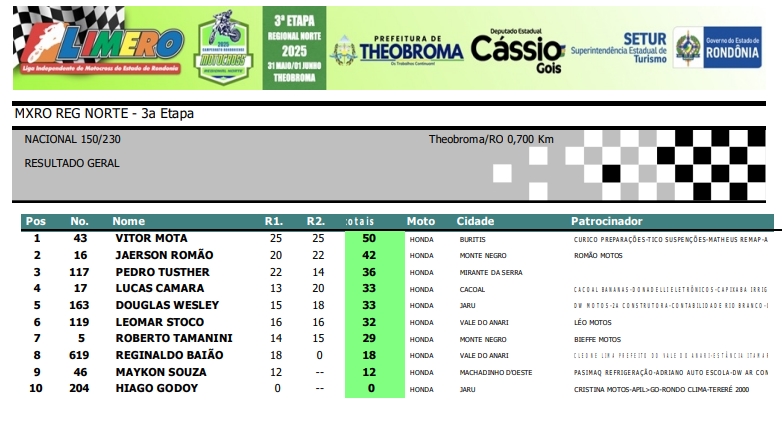 A prova que teve cerca de 100 inscrições de toda região foi homologada como a 3ª etapa do Campeonato Regional Norte da Limero – Liga Independente de Motocross de Rondônia. A competição em duas rodas foi disputada numa pista com cerca de 700 metros em seis categorias – Incentivo, Feminina, Importada Força Livre, Nacional 150/230, Importada MX3 e Nacional Força livre.