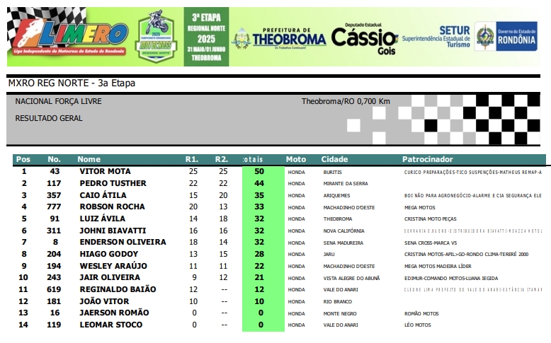 Na Nacional Força Livre, vitória incontestável do piloto Vitor Mota #43 de Buritis, que liderou as duas baterias de ponta a ponta. O piloto Pedro Tusther #117 de Mirante da Serra foi hegemônico nas duas largadas, mantendo a segunda colocação nas duas baterias. Na sequencia, subiram ao pódio os pilotos Caio Atila #357 (Ariquemes) em terceiro, o piloto ‘prata da casa’ Luiz Avila #91 de Thebroma na quarta colocação e fechando com Jhoni Biavatti #311 de Nova Califórnia. Confira resultados abaixo