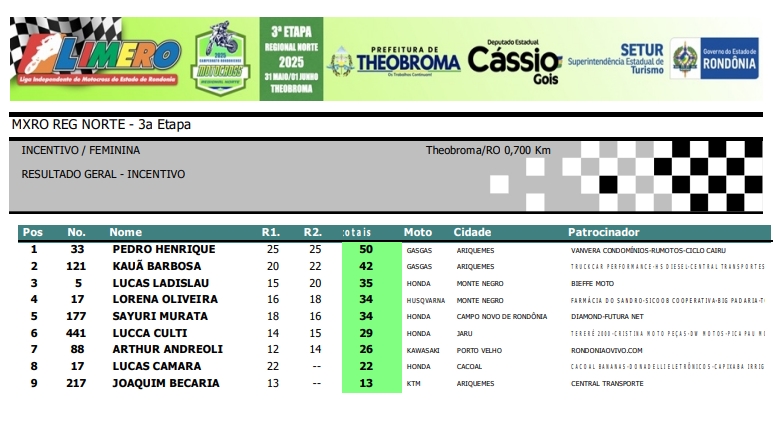 Na categoria Incentivo, que prepara os pilotos do futuro, Ariquemes ficou com as duas primeiras colocações, com Pedro Henrique #33 em primeiro e Cauã Barbosa #121 em segundo. A terceira e quarta colocação, ficou com Monte Negro com Lucas Ladislau #5, Lorena Oliveira #17. Em quinta posição, a jovem promessa Sayuri Murata #177 de Campo Novo. Confira resultado geral abaixo.
