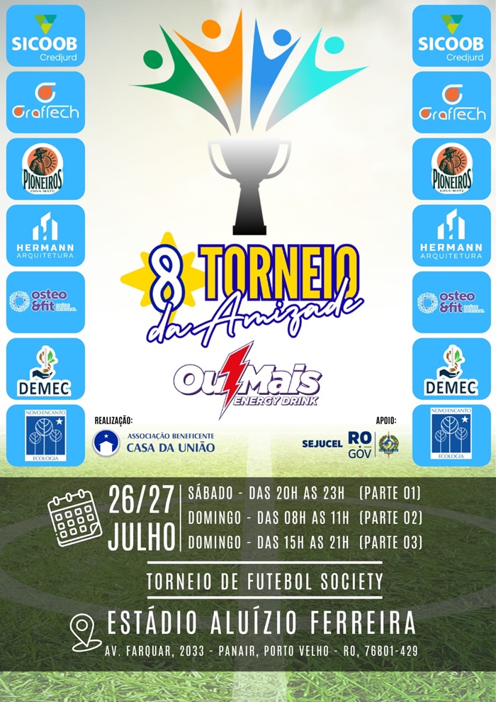 Neste fim de semana, o 8• Torneio da Amizade, de Futebol Society promovido pela Associação Casa da União Novo Horizonte, com apoio da Superintendência da Juventude, Cultura, Esportes e Lazer (Sejucel), do Governo de Rondônia.