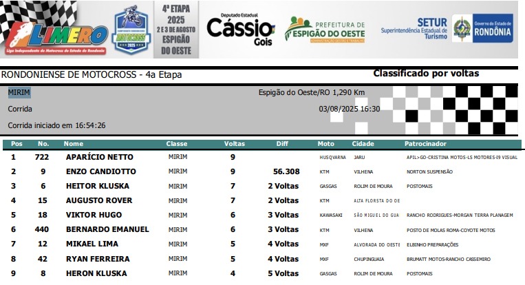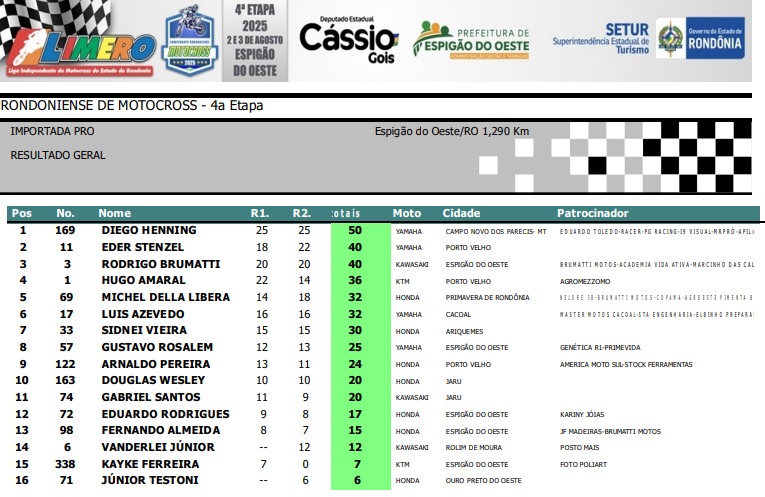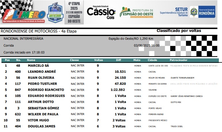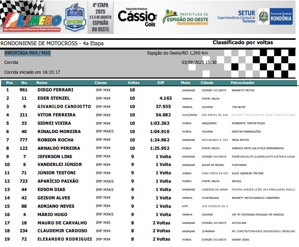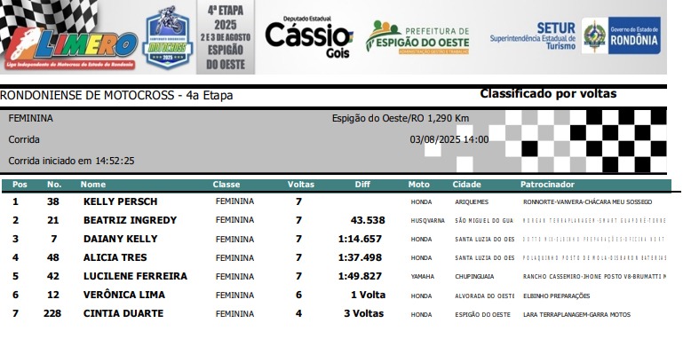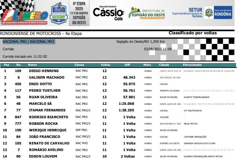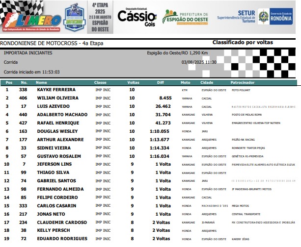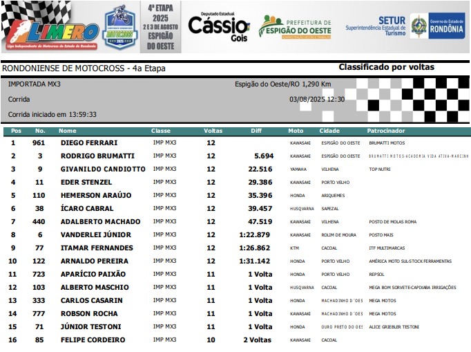Espigão D'Oeste reuniu os melhores pilotos de Rondônia em 11 categorias disputadas: Importada MX3, Importada MX4, Importada Pro, Importada Iniciante, Nacional 230, Nacional Intermediária, Nacional Pro / MX3, Feminina, Mirim, Júnior e Infantil.