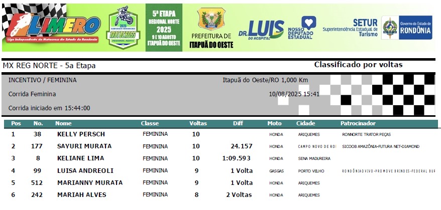 Vitoria de Kelly Persch #38 (Ariquemes), atual líder do estadual com uma novíssima Honda 250R. Na segunda colocação, a jovem promessa do MX estadual, Sayuri Murata # 177 de Campo Novo de Rondônia, que agora é patrocinada pelo Sicoob Amazonia. Keliane Lima #08 de Sena Madureira (Acre) ficou em terceiro.