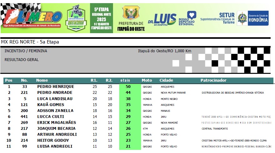 Na modalidade que garante o futuro do motocross em Rondônia, a categoria Incentivo teve largada com 11 pilotos no gate. Em primeiro colocado ficou o jovem piloto Pedro Henrique #33 de Ariquemes que venceu as duas baterias de ponta a ponta, seguido de Pedro Andrade #221 de Nova Mutum. Completaram o pódio Luca Landislau #5 de Monte Negro, Kaua Gomes #121 (Ariquemes) e Adson Zanella 3200 (Manaus).