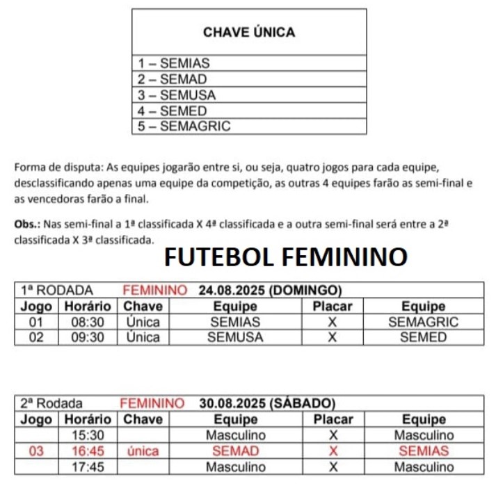 A rodada inicial terá o confronto entre as equipes da SEMIAS e da SEMAGRIC no primeiro jogo, e SEMUSA x SEMED na segunda partida. O campeonato tem cinco times inscritos e terá jogos aos sábados e domingos.