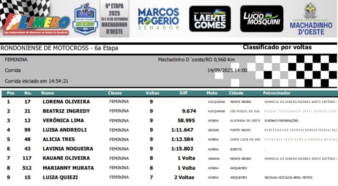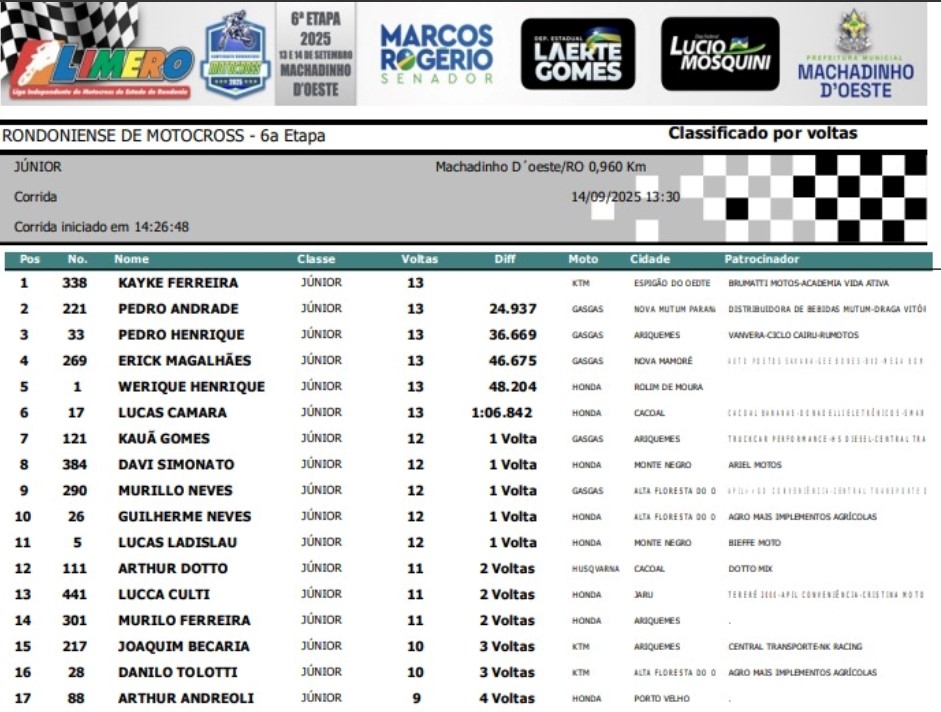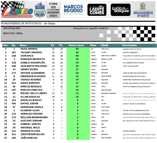 Nesse último final de semana, o município de Machadinho do Oeste (RO) foi palco da 6ª Etapa do Estadual de Motocross 2025. Uma corrida que contou com a inscrição de mais de 300 pilotos nas sete categorias em que é disputado o certame.