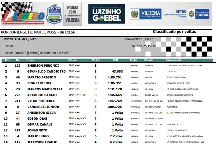 Veja como ficaram os resultados do Estadual de Motocross de Vilhena: