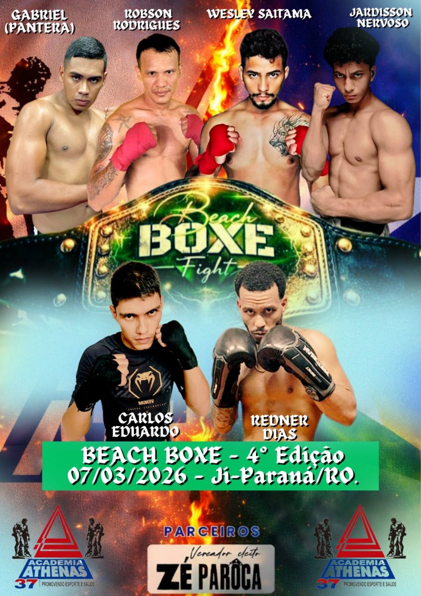 A Academia Athenas participará da 4ª edição do Beach Boxe, marcada para o dia 7 de março de 2026, em Ji-Paraná, com seis atletas confirmados e presença em disputas de cinturão e no card principal. A equipe chega ao evento com a meta de repetir o desempenho das edições anteriores, nas quais acumulou resultados expressivos.