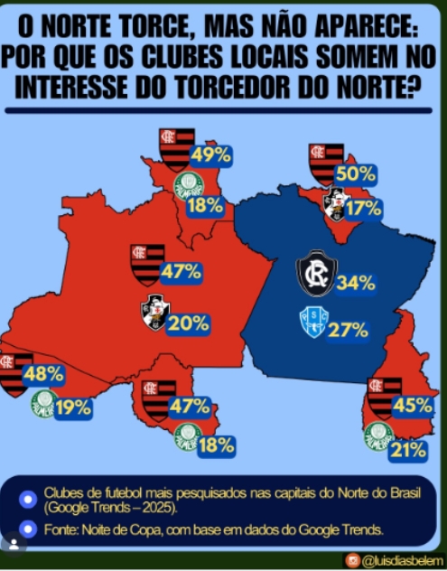 Levantamento do Google Trends (2025) indica que Clube de Regatas do Flamengo e Sociedade Esportiva Palmeiras concentram o maior interesse de busca em Rondônia. O padrão se repete nas capitais da Região Norte, onde clubes do eixo Sudeste dominam o imaginário digital, impulsionados por maior exposição midiática, receitas elevadas e presença constante em competições nacionais.