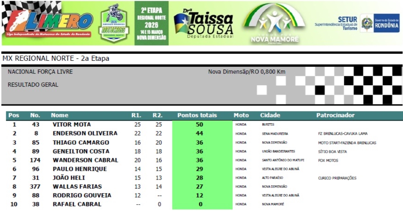 Na segunda colocação ficou o jovem Thiago Alves (#34), de União Bandeirantes. De Campo Novo de Rondônia, a atleta patrocinada pela Sicoob Amazônia e Auto Posto Avenida, Sayuri Murata (#177), ficou em terceiro. Na quarta colocação, a piloto Luisa Andreoli (#99), de Porto Velho. Em quinto ficou o corajoso Marcos Cesar (#88), de Nova Mamoré.