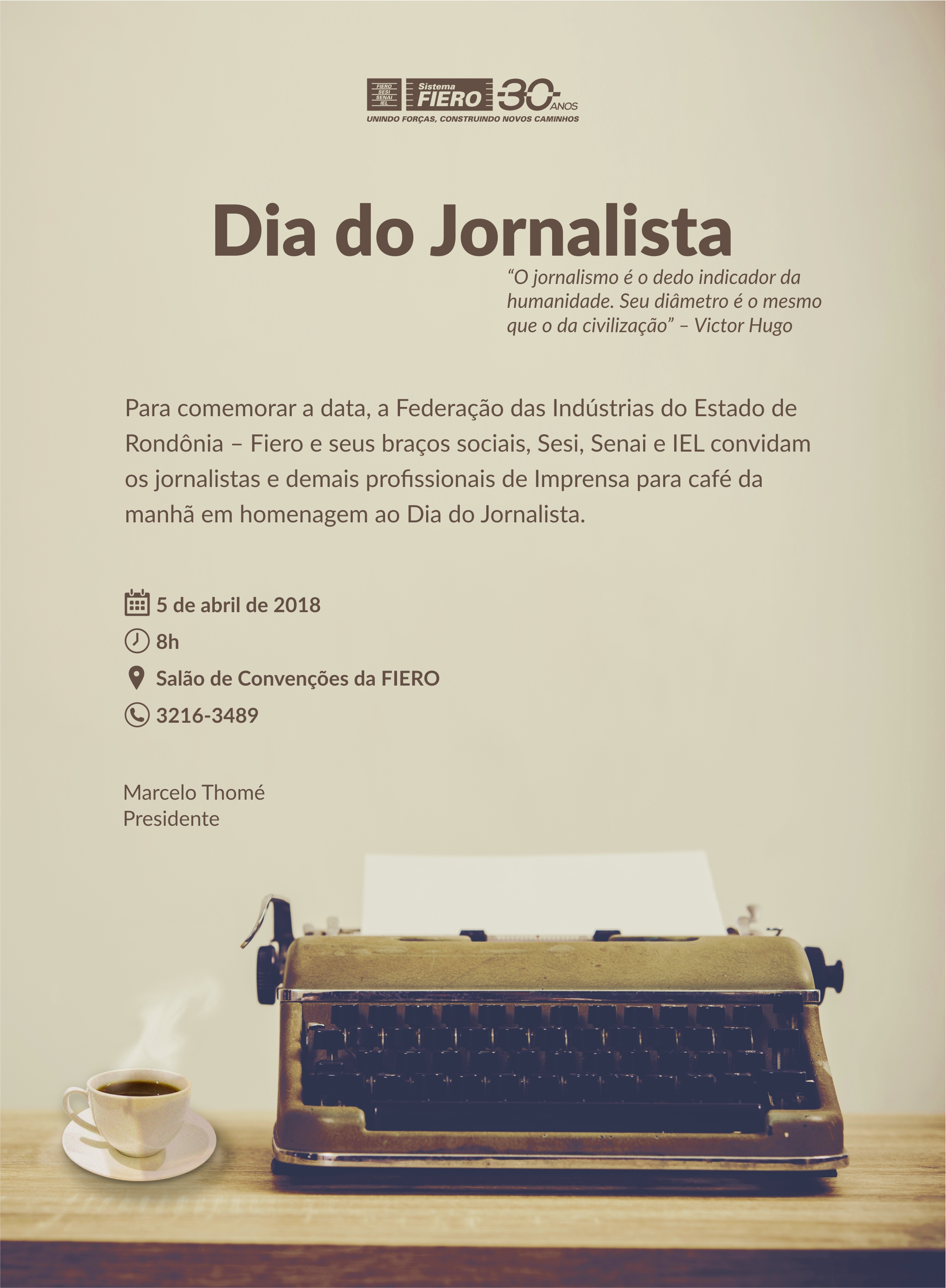 O presidente da Fiero, Marcelo Thomé ressalta os jornalistas como o elo mais importante na aldeia global. “É uma honra a oportunidade de celebrar a data de um dos mais importantes segmentos profissionais, que é o jornalismo, a quem devotamos profundo respeito.