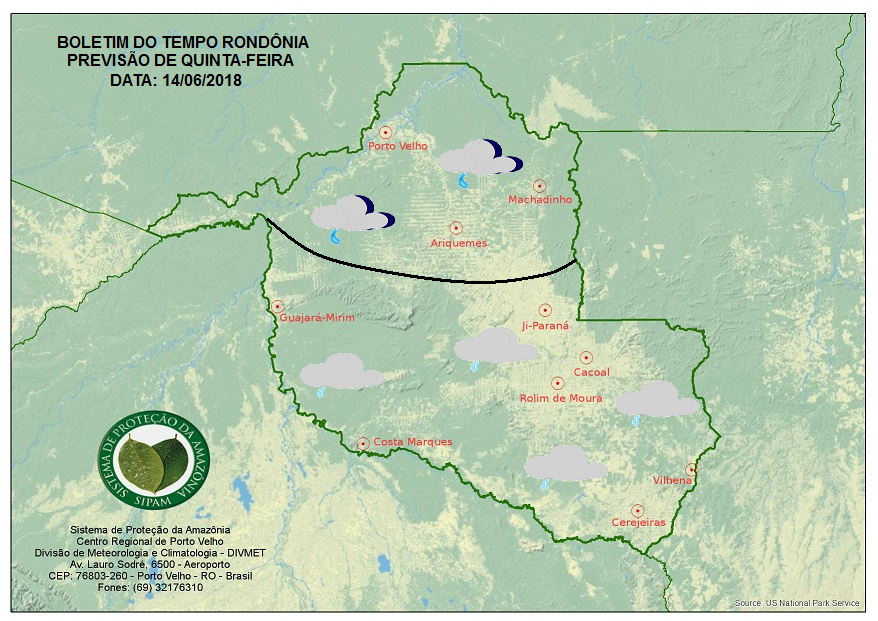 A friagem atuará em toda Rondônia nesta quinta-feira. A previsão é de um dia de céu nublado a encoberto, com pouco sol e possibilidade de chuva a qualquer hora do dia na capital e no Vale do Jamari. Nas demais regiões do estado o dia será de céu nublado a parcialmente nublado, com algumas aberturas de sol, mas sem previsão de chuva. A temperatura fica amena em todo o estado, especialmente nas cidades do Cone-Sul e do Vale do Guaporé, onde a massa de ar polar atuará com maior força.
