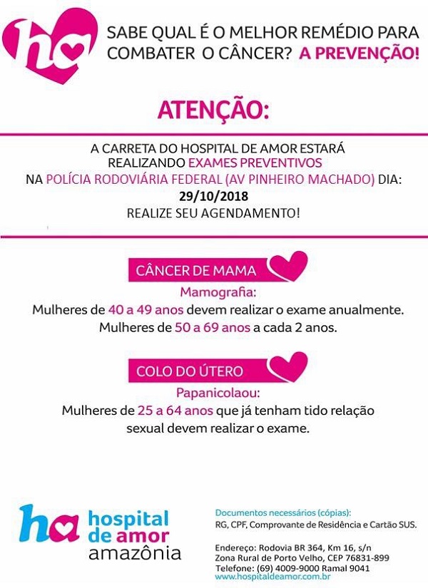 Uma carreta do hospital ficará estacionada na Superintendência da PRF (Avenida Pinheiro Machado, 1276, Porto Velho/RO) e profissionais da área estarão à disposição da população para realização de exames preventivos de câncer de mama e do colo do útero.