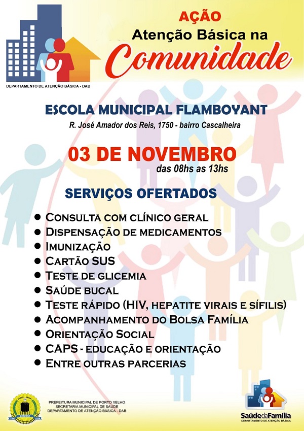 Neste sábado, 03, no Bairro Cascalheira, acontece mais uma edição do projeto “Atenção Básica na Comunidade”, das 8h às 13h. A ação é promovida pela Secretaria Municipal de Saúde (Semusa). O atendimento será na Escola Municipal de Ensino Fundamental Flamboyant, na Avenida José Amador dos Reis, nº 1570. Esta é a segunda vez que o Município vai ao Cascalheira este ano. O atendimento é aberto a todos os moradores dos bairros e do entorno.