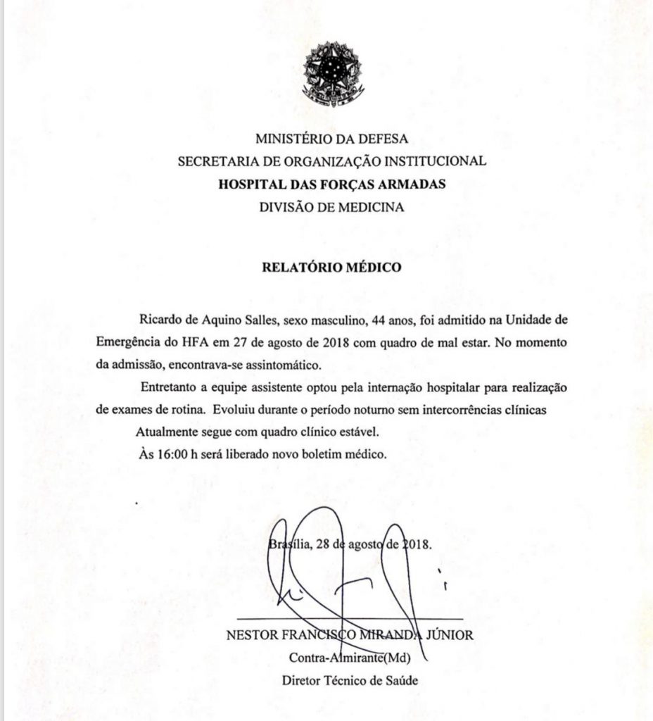Na madrugada desta quarta-feira (28/08/2019), o ministro do Meio Ambiente, Ricardo Salles, deu entrada no Hospital das Forças Armadas (HFA), em Brasília (DF). De acordo com o boletim da unidade de saúde, o chefe da pasta estava com um “quadro de mal-estar”. “No momento da admissão, encontrava-se assintomático”.