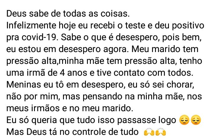 “Infelizmente recebi o teste e deu positivo pra Covid-19. (…) estou em desespero agora”, escreveu a jovem, que tem o esposo e a mãe com problemas de pressão alta. Ela afirma que teve contato com algumas pessoas de sua família, incluindo sua irmã de apenas 4 anos.