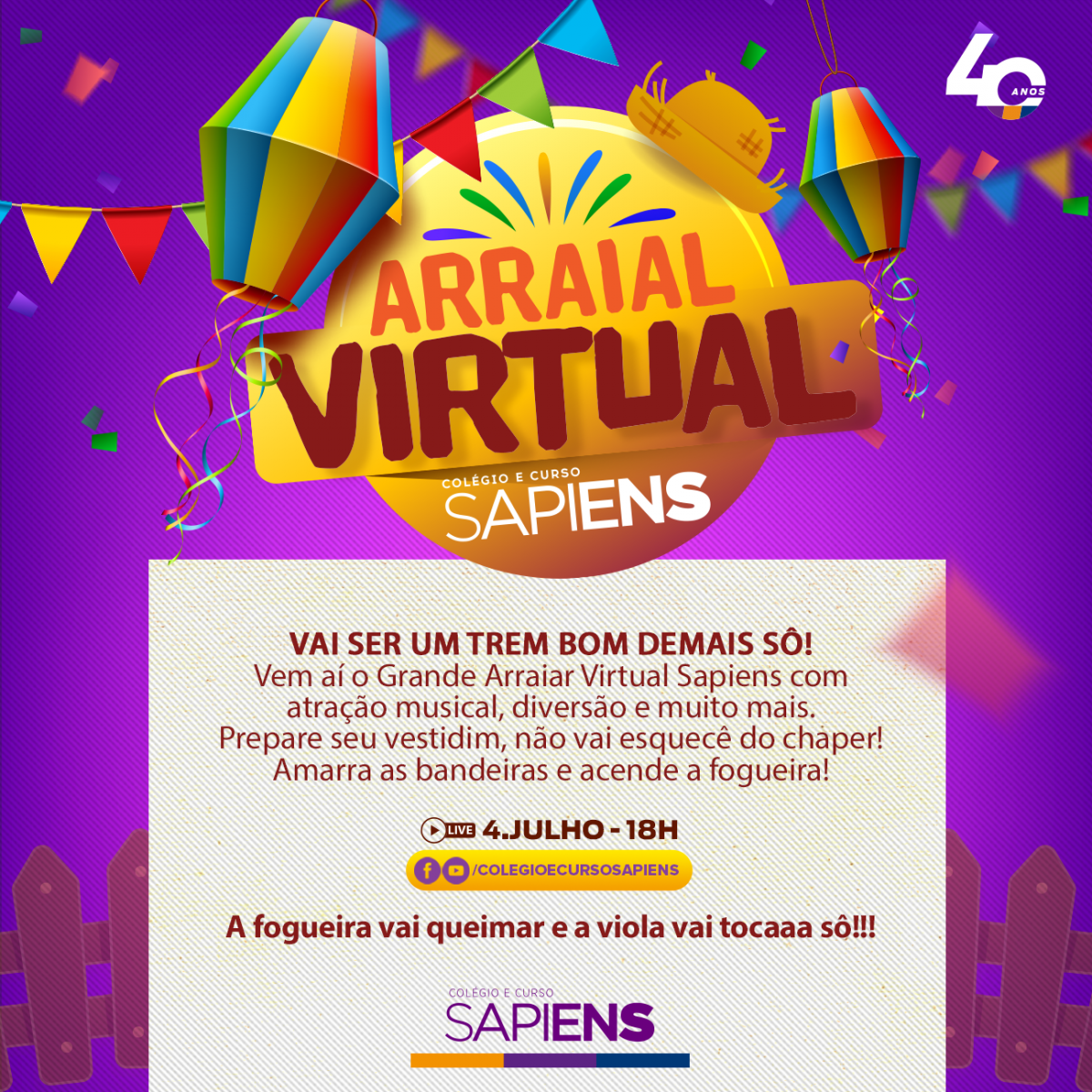 A transmissão acontecerá dia 4 de julho, a partir das 18h, no Facebook e Youtube do Colégio com a presença do trio de forró Casca de Alho e apresentações remotas. Pais e alunos poderão interagir postando fotos ou vídeos e marcando #ArraialVirtualSapiens em suas legendas.