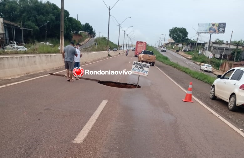 Uma cratera assustou motoristas que passaram, na manhã deste sábado (20), pela BR-364, entre o viaduto do Trevo do Roque e da Campos Sales, no perímetro urbano da cidade de Porto Velho (RO).