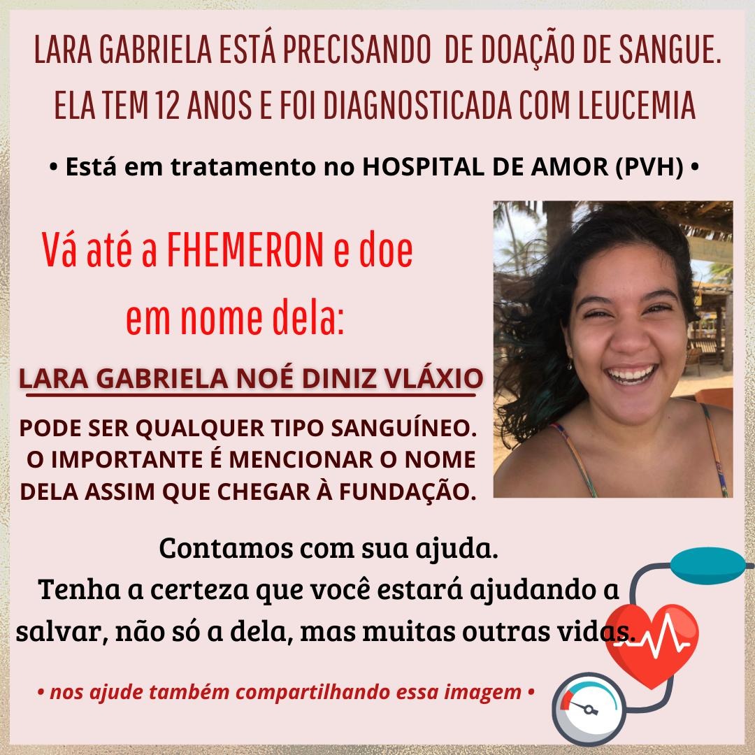 A família da Lara Gabriela Noé Diniz Vláxio, de 12 anos, moradora de Porto Velho (RO), criou uma campanha para dar continuidade no tratamento dela. Eles pedem a toda população para doar sangue e assim, poder ajudar ela e todos que precisam.