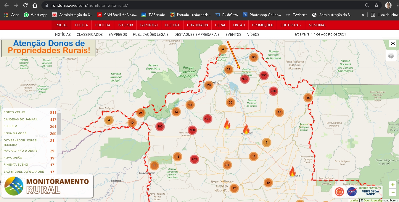 Mais uma vez, a maioria dos focos de incêndios está na Floresta Nacional do Jacundá, que fica entre Porto Velho e Candeias do Jamari. O Rondoniavivo já havia alertado, na última segunda-feira (16), que nessa área haviam 260 focos de incêndio.