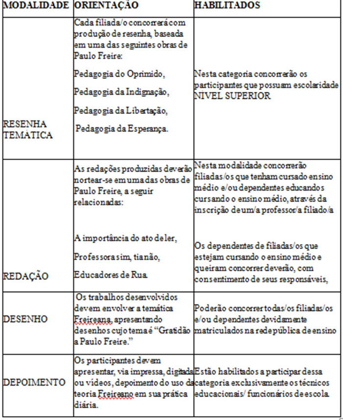“Essa é mais uma iniciativa em comemoração ao centenário de Paulo Freire um dos maiores teóricos e militantes na defesa de uma educação popular e emancipadora em nosso país. Convidamos os nossos companheiros e companheiras, bem como aos seus dependentes que participem do concurso e que estejam atentos ao Edital para evitar qualquer tipo de transtorno quanto as regras estabelecidas”, disse Lionilda Simão, presidenta do Sintero.
