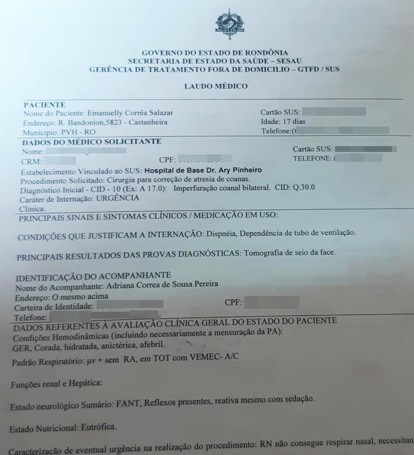 O laudo atestado pelos médicos aponta que Manu tem que fazer uma cirurgia de correção de atresia canoas. Esse procedimento não é realizado em Rondônia e tem que ser feito em outro estado.