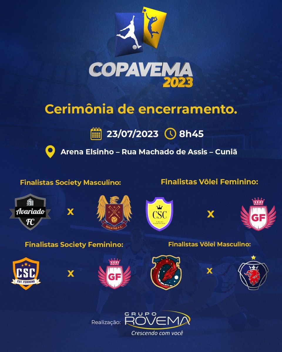 Acontece no dia 23 de julho, domingo, a final da 5ª Copavema 2023 organizada pelo Grupo Rovema. A competição é formada por equipes integradas pelos colaboradores do Grupo, nas modalidades de vôlei e society, masculino e feminino.