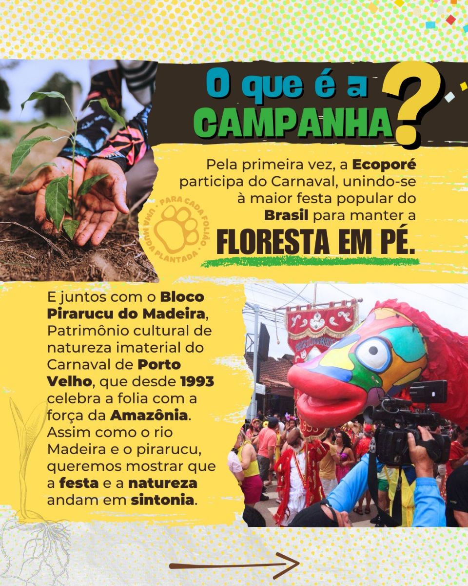 Neste carnaval, a Ecoporé uniu-se ao bloco Pirarucu do Madeira para lançarem a campanha “para cada folião, uma muda plantada”, com a finalidade de brincar o carnaval e contribuir com a restauração ecológica. Esta é a primeira vez que a Ecoporé executa uma ação no contexto da festa mais popular do país.