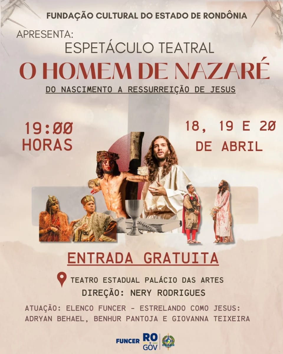 O Teatro Palácio das Artes será palco nos dias 18, 19 e 20, da encenação da peça "O Homem de Nazaré", s partir das 19 horas, com entrada gratuita.